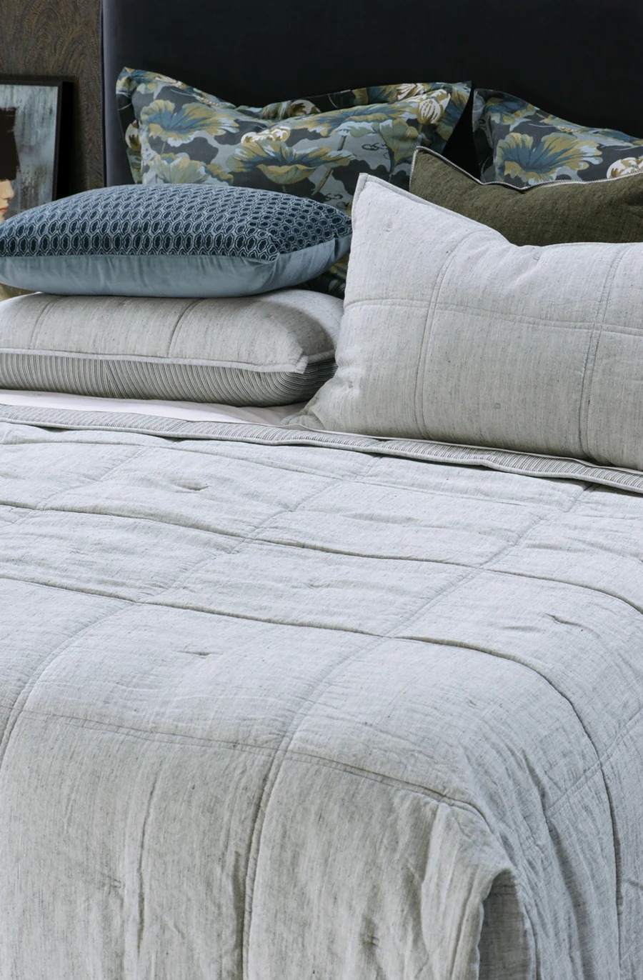 Through texture, colour and line, this bedspread of quilted squares celebrates sophisticated simplicity with a warm pale grey chambray cotton top and a co-ordinating softly textured reverse in an ivory and graphite stripe. Spatial and contemporary, Noma grey adds tranquility to your interiors.