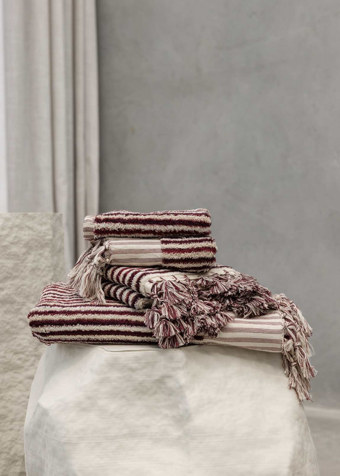 The Burgundy Stripe Face Cloth is traditionally woven from organic cotton with a mix of three rich burgundy threads. The densely woven, silky soft, natural fibres feel blissfully indulgent and will complement any design aesthetic in the home.